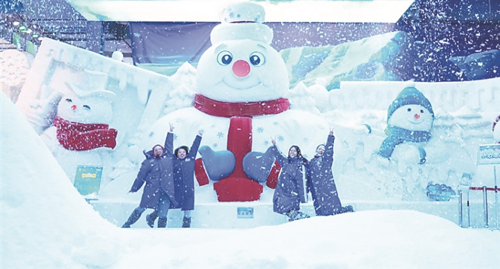 与大雪人合影。